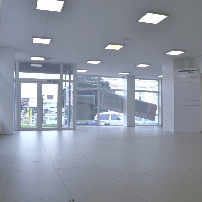 Největší možná prodejní plocha je 225 m2 ve tvaru F. Je možno přidat druhé vstupní dveře a rozdělit prostor pro dvě menší oddělené prodejny. Suterén má 85 m2, s nákladovým výtahem, vhodný pro sklad nebo dílnu.