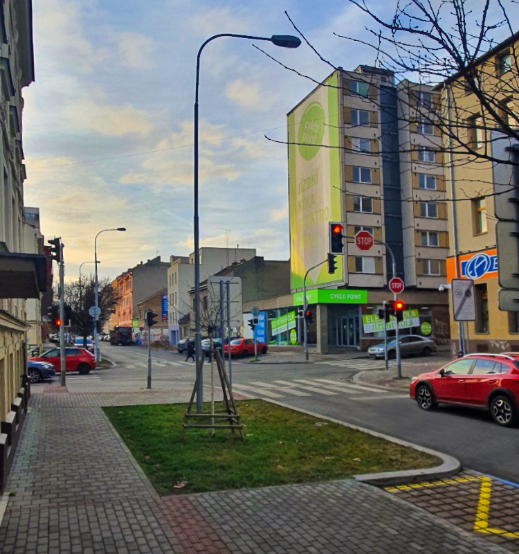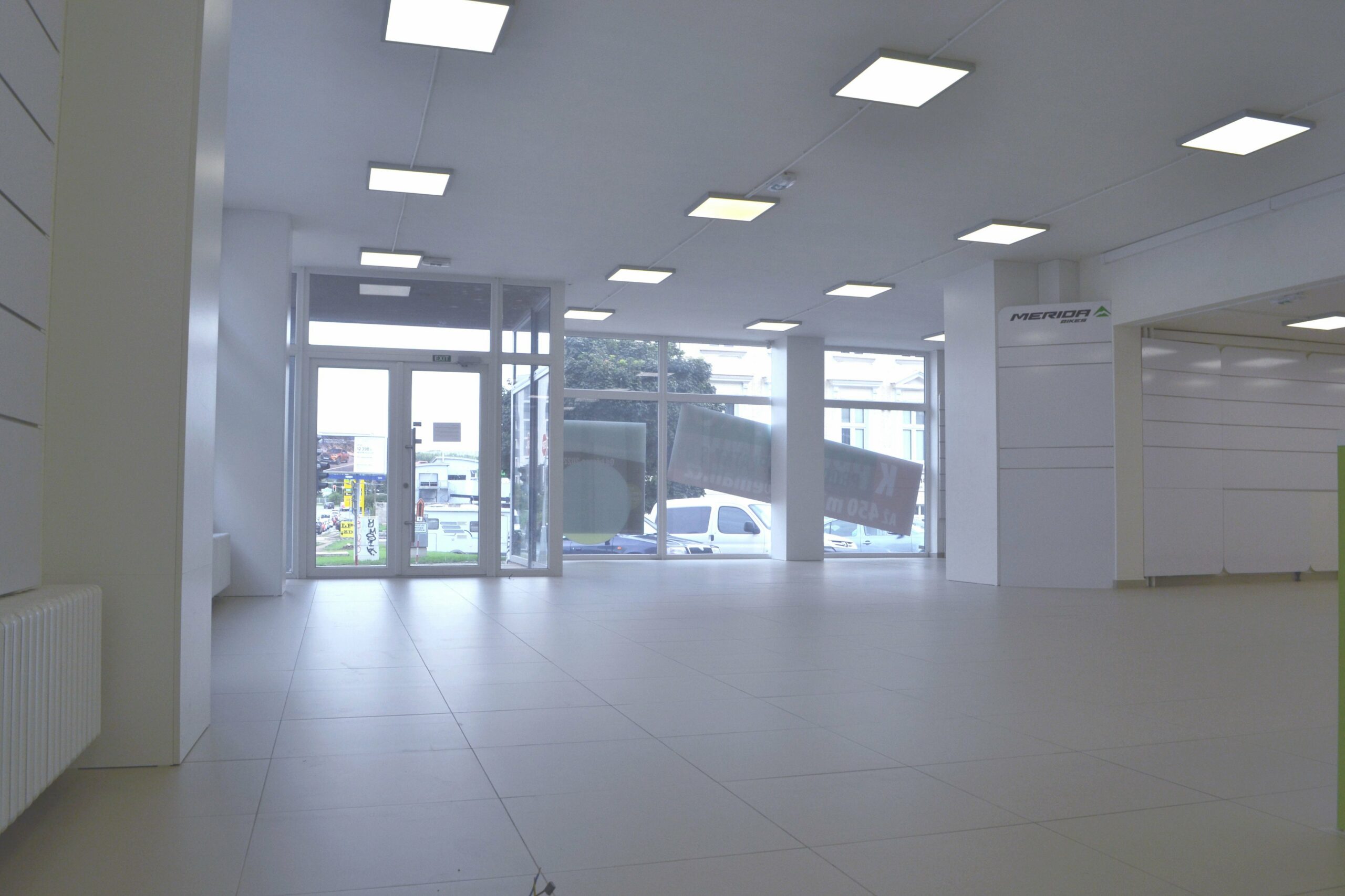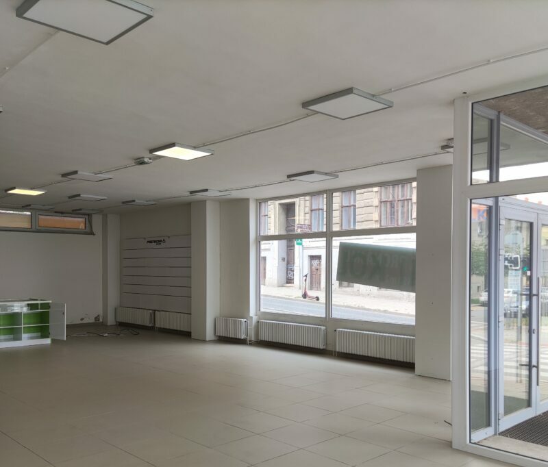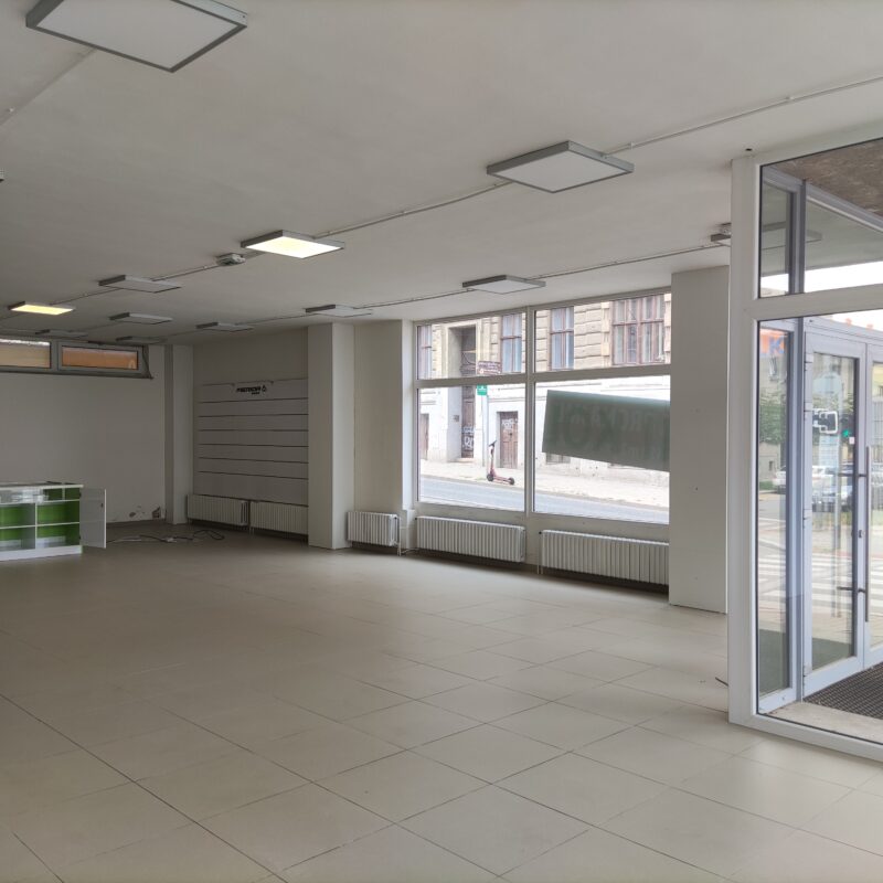 Největší možná prodejní plocha je 225 m2 ve tvaru F. Je možno přidat druhé vstupní dveře a rozdělit prostor pro dvě menší oddělené prodejny. Suterén má 85 m2, s nákladovým výtahem, vhodný pro sklad nebo dílnu.