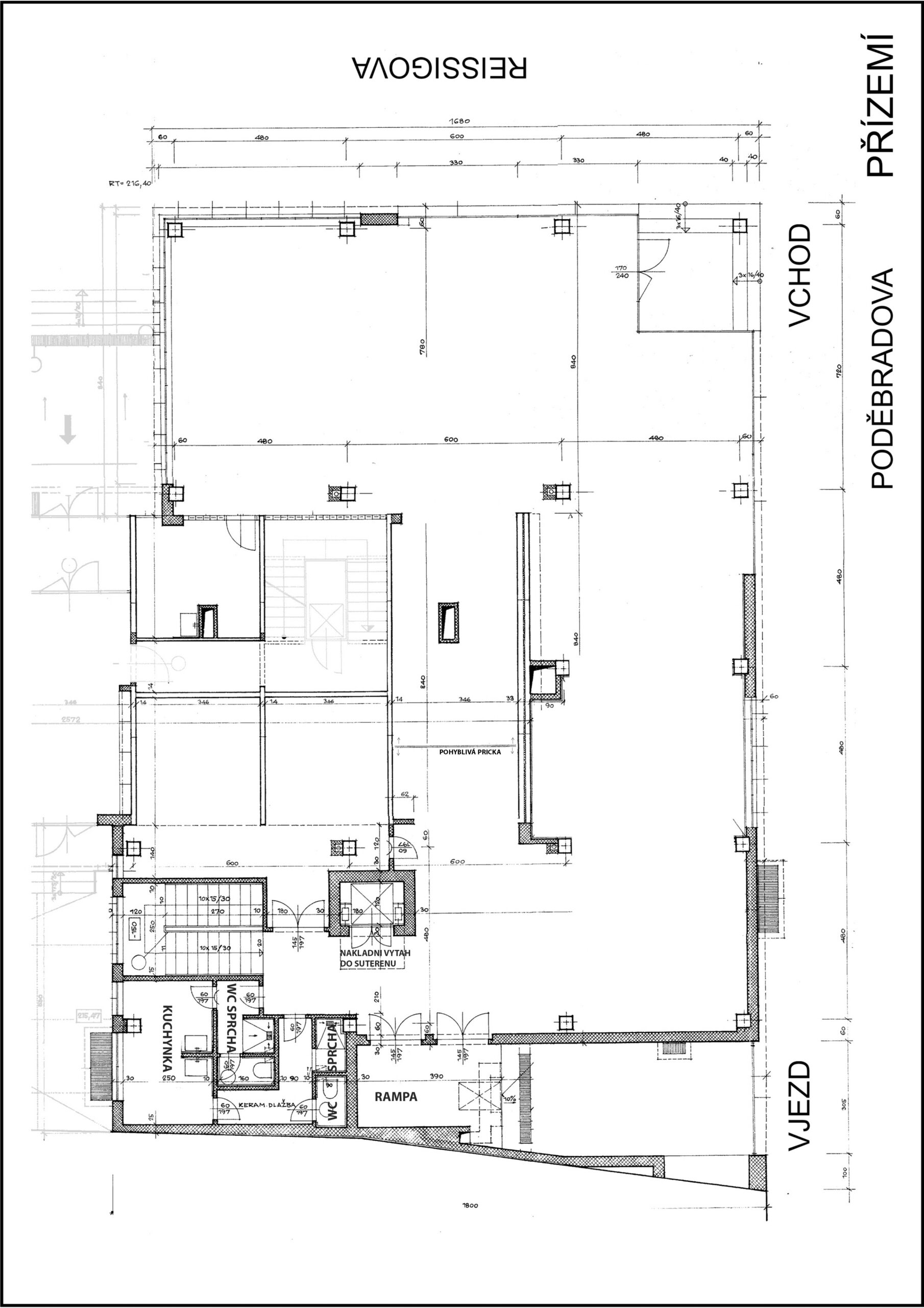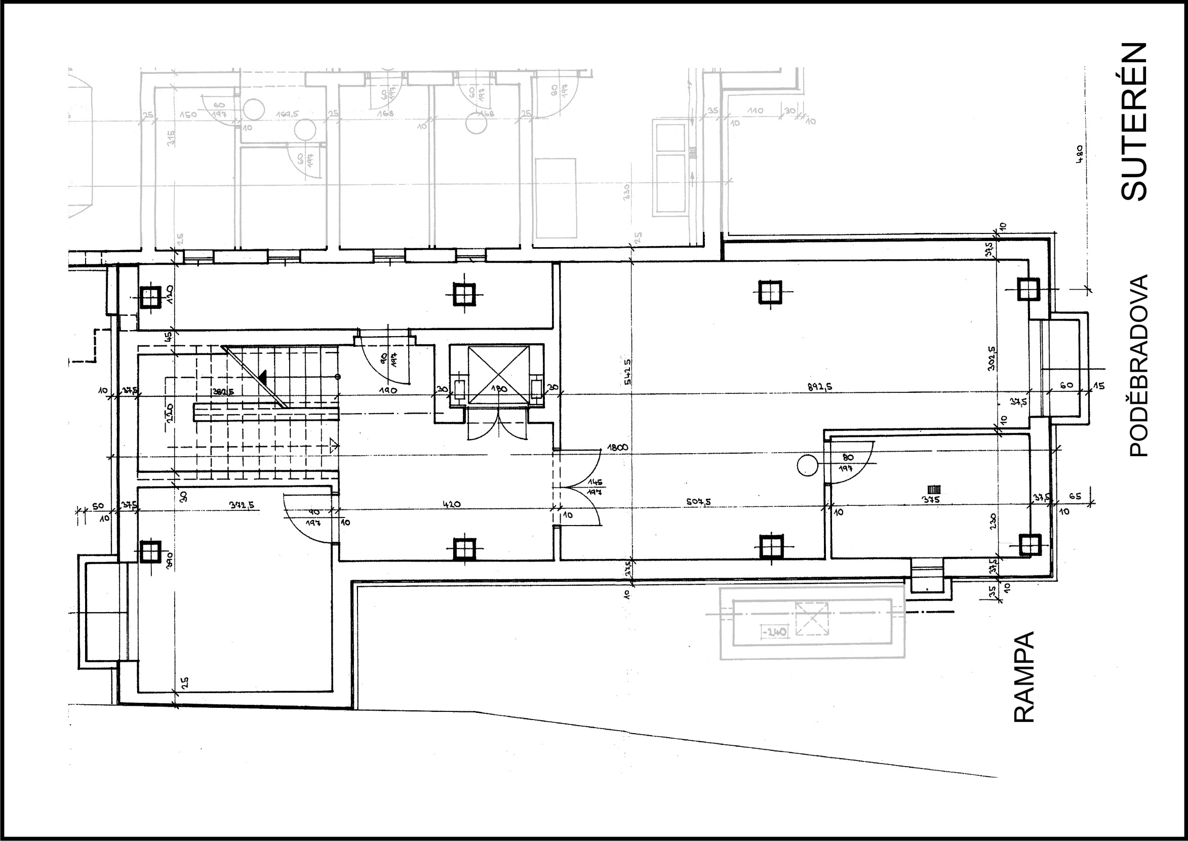 320 m2 v přízemí je rozděleno na prodejní, kancelářské a skladovací prostory.